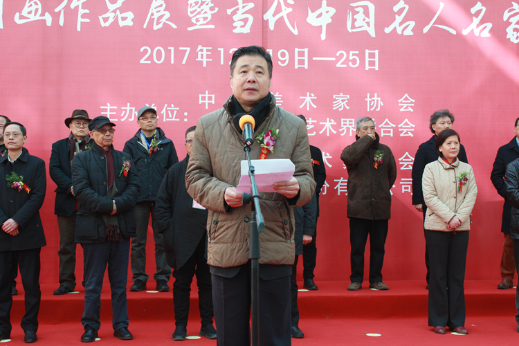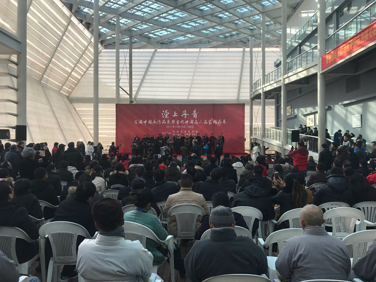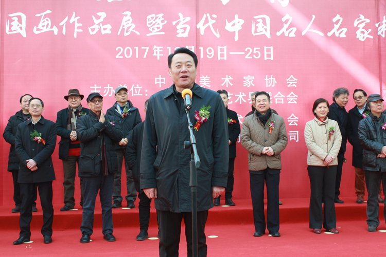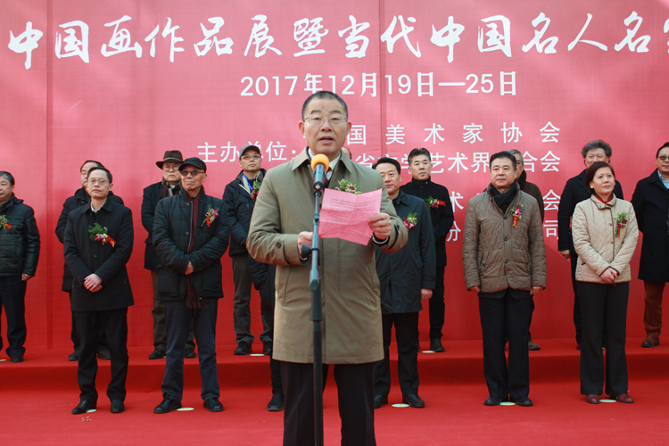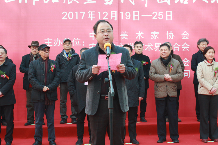 为深入学习贯彻党的十九大精神,坚定文化自信,更好地服务于中国美术事业,传承与发展中华优秀传统文化,由中国美术家协会、安徽省文学艺术界联合会主办,安徽省美术家协会、中国宣纸股份有限公司承办,“泾上丹青──全国中国画作品展暨当代中国名人名家精品展”于2017年12月19日在安徽泾县中国宣纸博物馆举行开幕式。中国美术家协会分党组成员、副秘书长杜军,安徽省委常委、宣传部长虞爱华,安徽省文联党组书记何颖,安徽画院名誉院长王涛,中国国家画院副院长曾来德、艺委会秘书长刘建,泾县县委书记耿鹏、县长孙广东,中国艺术研究院研究员王镛、郑工,中央美术学院教授罗世平,中国国家博物馆书画研究创作中心负责人石峰,中央美术学院中国画学院党委书记于光华,南京艺术学院教授方骏,国防大学军事文化学院美术系教授任惠中,《美术》杂志社长、总编尚辉,安徽省美协名誉主席张松、主席杨国新,安徽省美术家协会秘书长谢宗君,宁夏美术家协会名誉主席、宁夏文史研究馆副馆长胡正伟,海军政治部创作室创作员甘长霖,人社部中国书画人才专委会主任萧瀚,清华大学美术学院教授陈辉,上海市美术家协会副主席、秘书长陈琪,江苏省美协副主席尹石,四川省美协副主席李青稞,天津画院专职画家谭乃麟,北京印刷学院教授孙浩,天津美术学院副教授魏云飞,《中国美术报》执行主编王平等领导、嘉宾出席了开幕式,开幕式由中国宣纸股份有限公司党委书记、董事长胡文军主持。