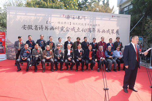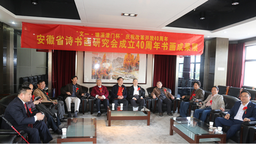 安徽省诗书画研究会会长、著名画家朱秀坤在开幕式上,介绍了研究会成立至今的概况和文化交流活动。他说,改革开放初期,每个文学艺术工作者都在认真寻求和重新审视民族文化传承的模式、地位和作用。正是这样的历史转型契机,使得江淮大地一批致力于传承华夏文化、讴歌时代风采的中青年书画家,因志趣相投而谋划成立书画研究会。得到了时任安徽省委副书记、书法大家张恺帆和时任安徽省政协副主席、全国著名书画大师赖少其等省领导的高度赞赏和重视,更是博得了一大批书画名家的关注和参与。在萧龙士、孔小瑜、徐子鹤、葛介屏、司徒越、李百忍、黄叶村等艺术大师的积极推动下,“安徽省逍遥津书画研究会”由周建豫、王家琰、杨国华等人发起,在合肥宣告成立。一时间声名大振,辉煌一时。可谓是改革开放初期全国书画艺术界一道亮丽的风景线。后经安徽省民政厅审批取得了社会团体独立法人资格,并更名为“安徽省诗书画研究会”。